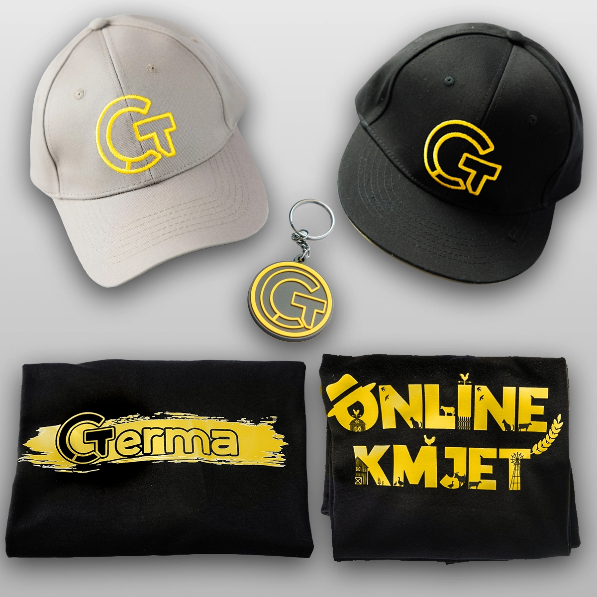 VSE V ENEM paket je največ, kar lahko dobiš v GERMA shopu – obe majici (GERMA + Online Kmjet), obe kapi (črna s šiltom + siva z ukrivljenim šiltom) in še obesek z GERMA logom.